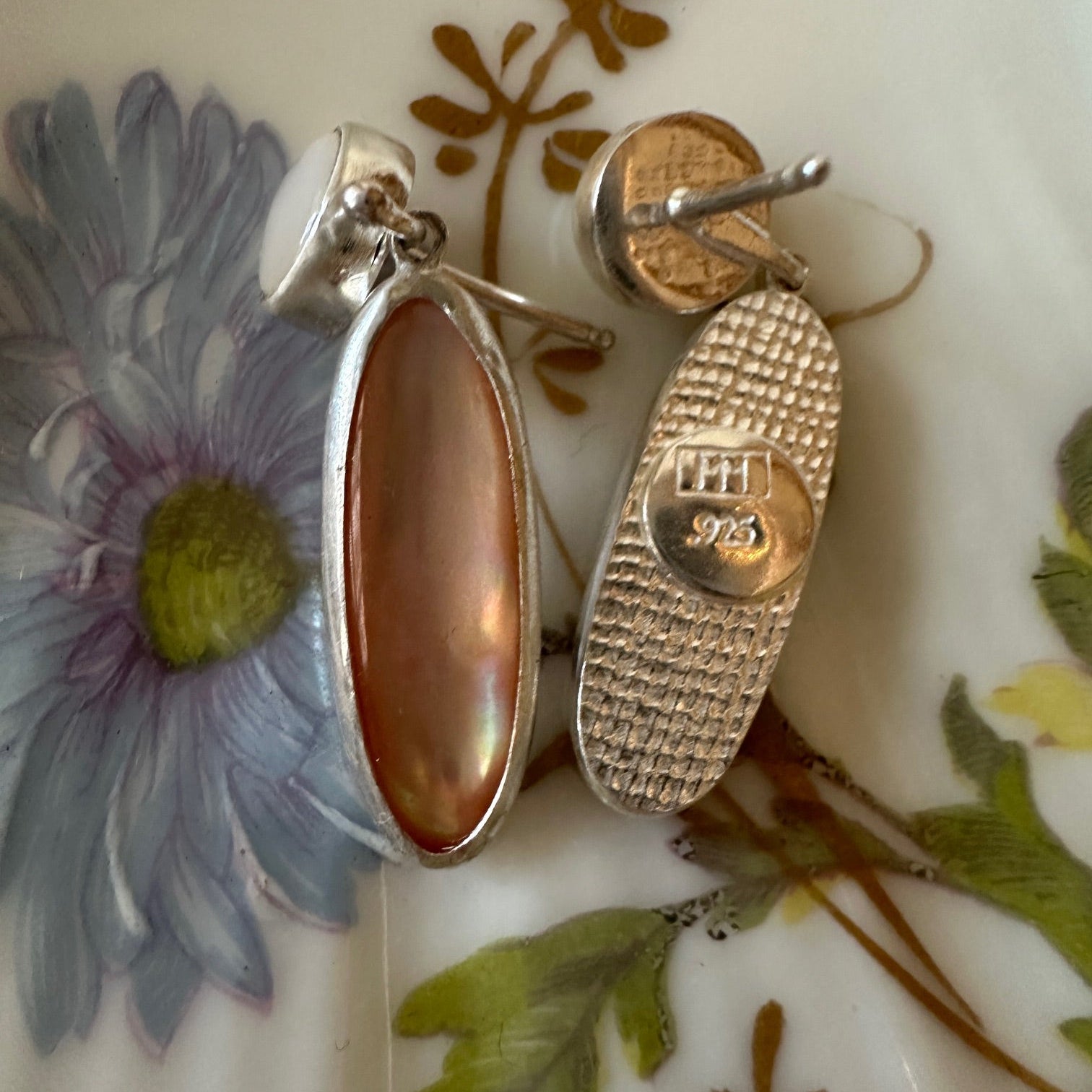The two tiny round cabochon and the pink oval dangles are both Mother of Pearl pieces. They are set in Sterling Silver. They have sterling silver posts and backs. They have a linen texture on the back. They are one fourth of an inch wide and they hang down one and one fourth of an inch long.